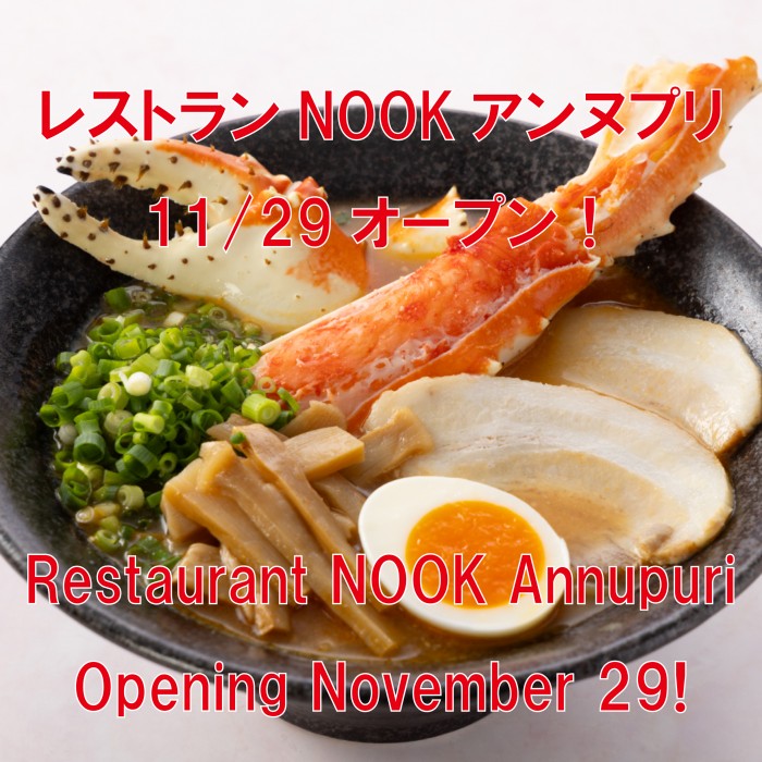 We are pleased to announce that Restaurant NOOK Annupuri will open as scheduled on Saturday, November 29th, at 11:00 AM.